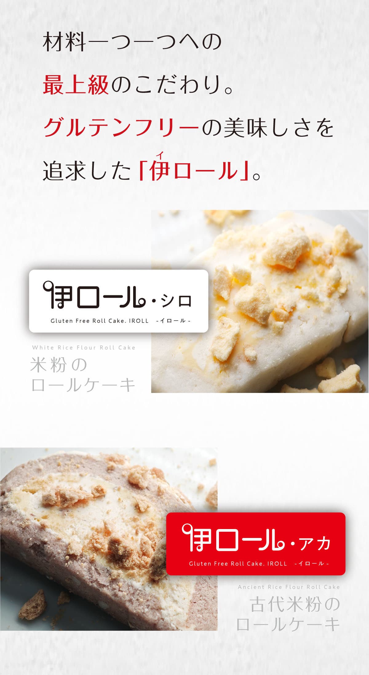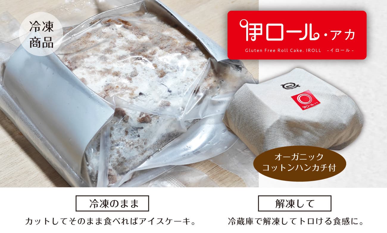 赤い伊ロールの「アカ」は、生地に卵白と無農薬・有機肥料の米粉と古代米粉を使用し、生クリーム&カスタードには、無農薬・有機肥料の北海道産オーガニックあずきをブレンドしています。「シロ」と同じく口にいれるとすぐほどけるスポンジは中のあずきクリームと一体となり、風味豊かな上質な味を作り上げています。