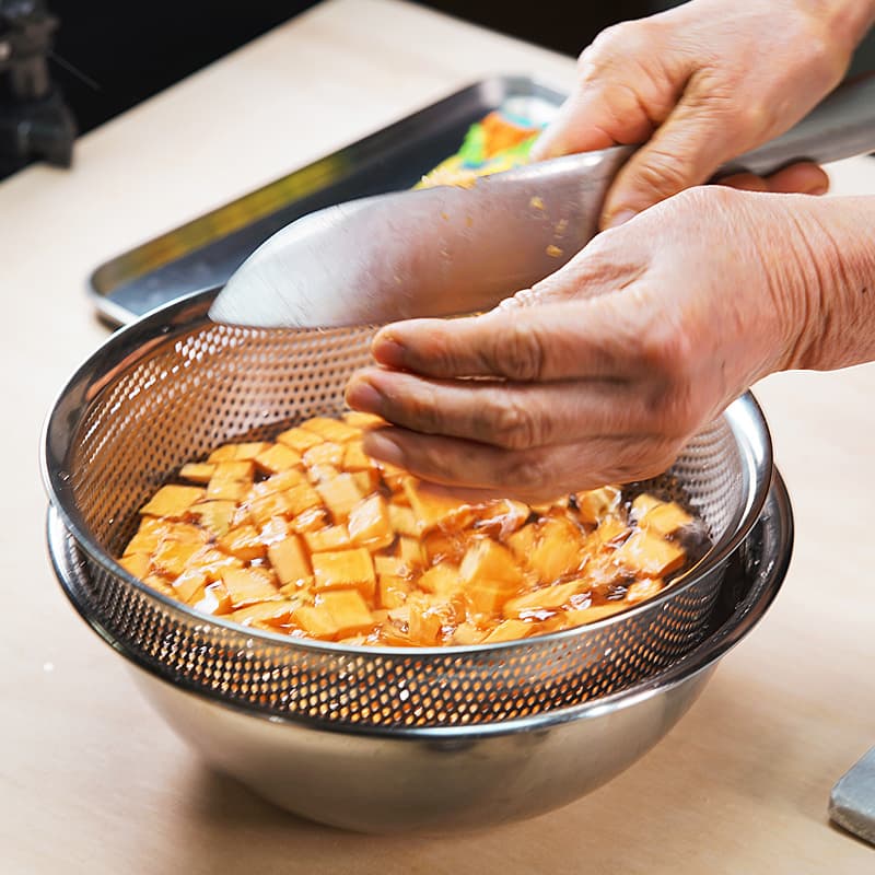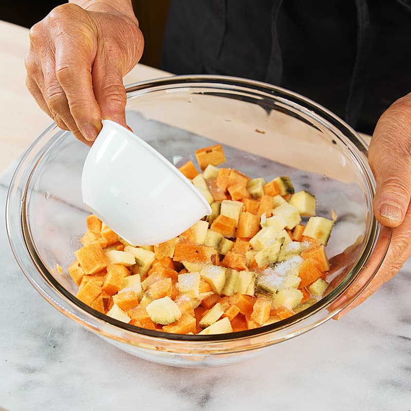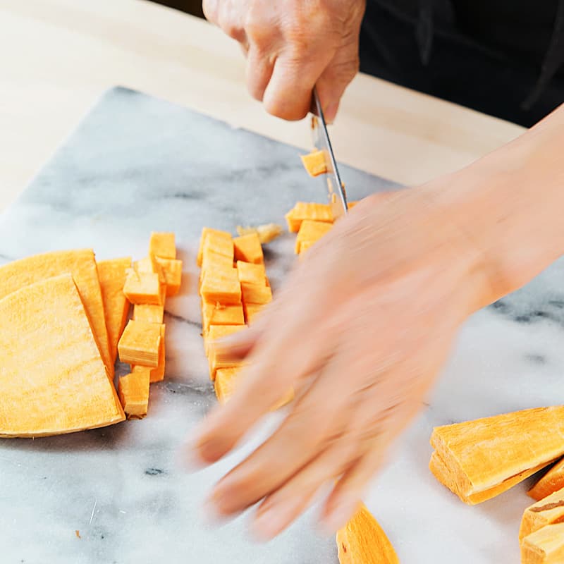 皮を剥いた500gのサツマイモをサイコロ状にカットしていきます。