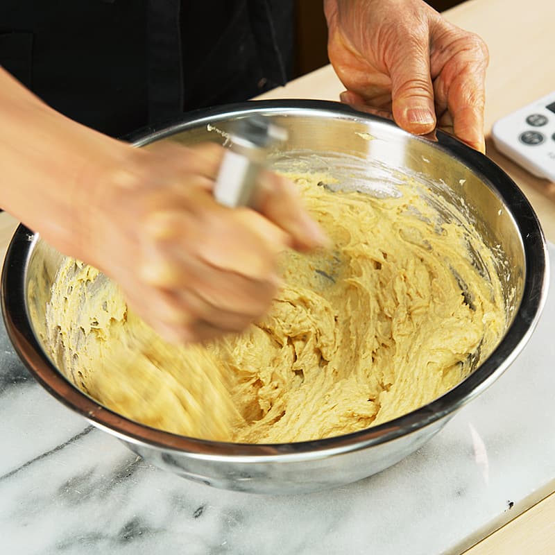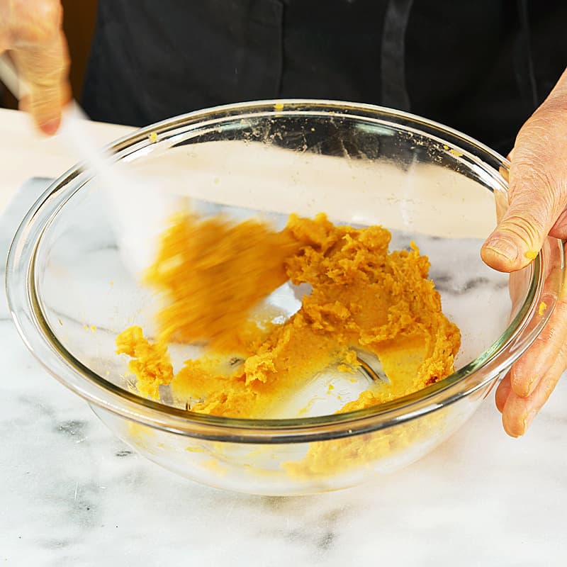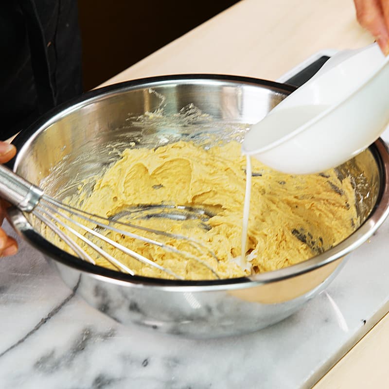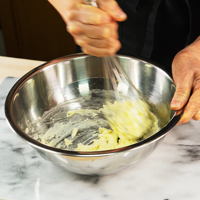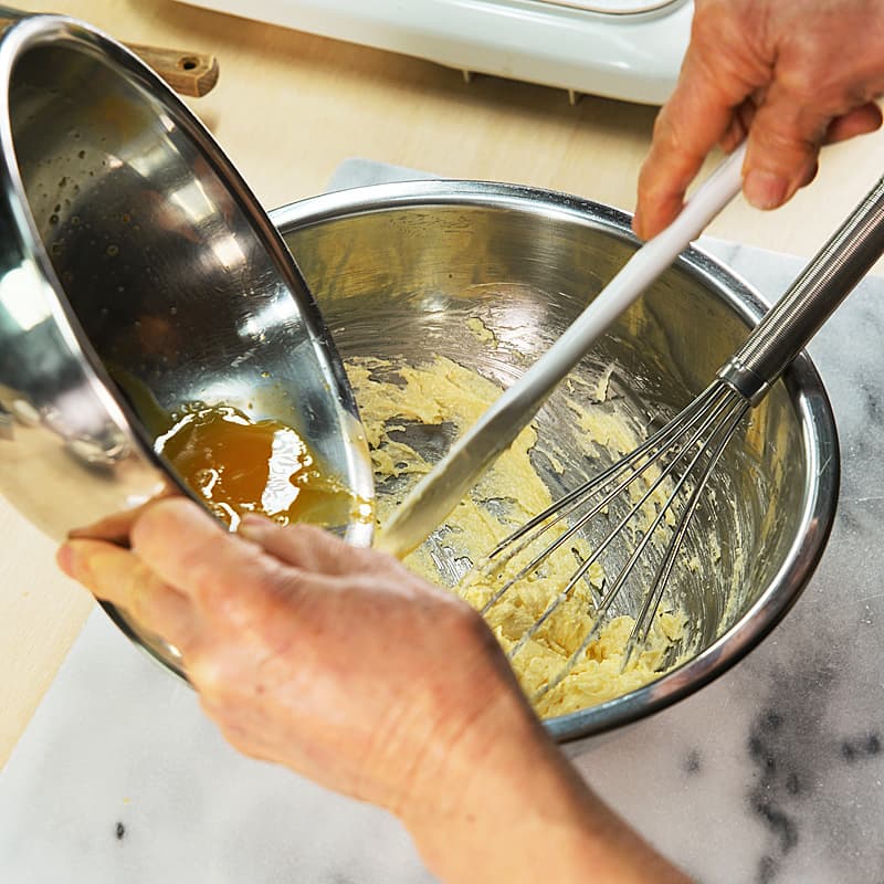 バターにたまごを少しずつ入れながら混ぜていきます。