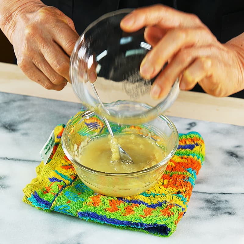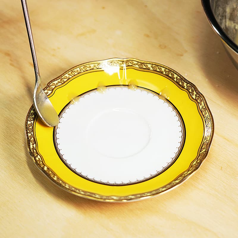 たまご1個と25gのハチミツを合わせて、ハチミツが溶けるくらいの温度まで温めながら(湯煎・直火・IH)混ぜてください。