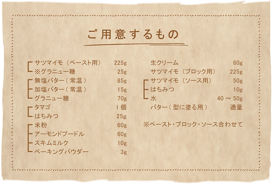 サツマイモは紅はるかと隼人芋を1本ずつ使用していますがお好きなものをお使いください。